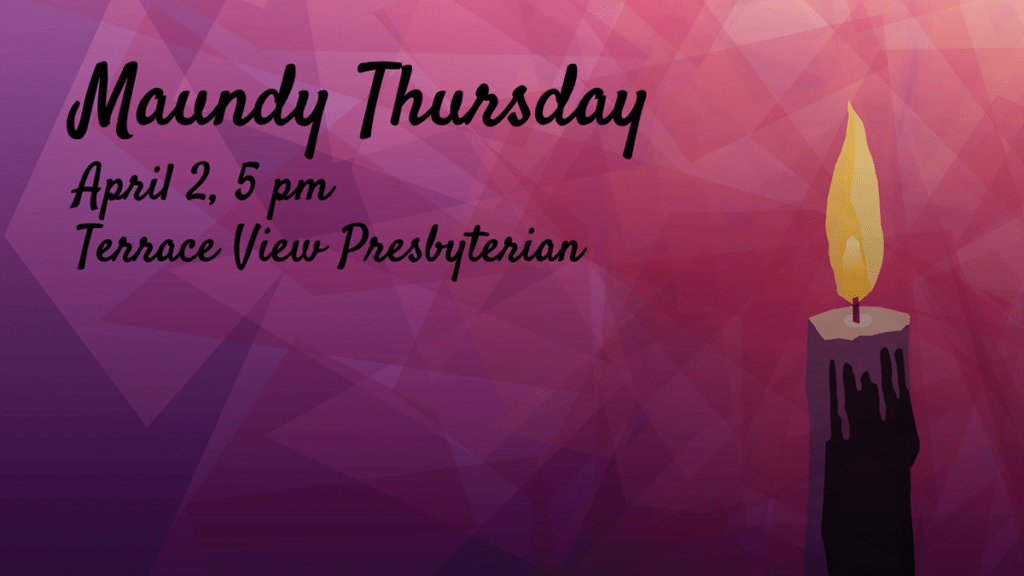 On Maundy Thursday, the Church remembers the last evening Jesus shared with his disciples in the upper room before his arrest and crucifixion. Join us in-person at Terrace View Presbyterian Church for worship centered on the Sacrament of Communion as we rehearse the events of Jesus’ Last Supper.